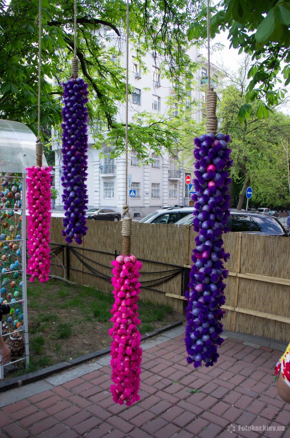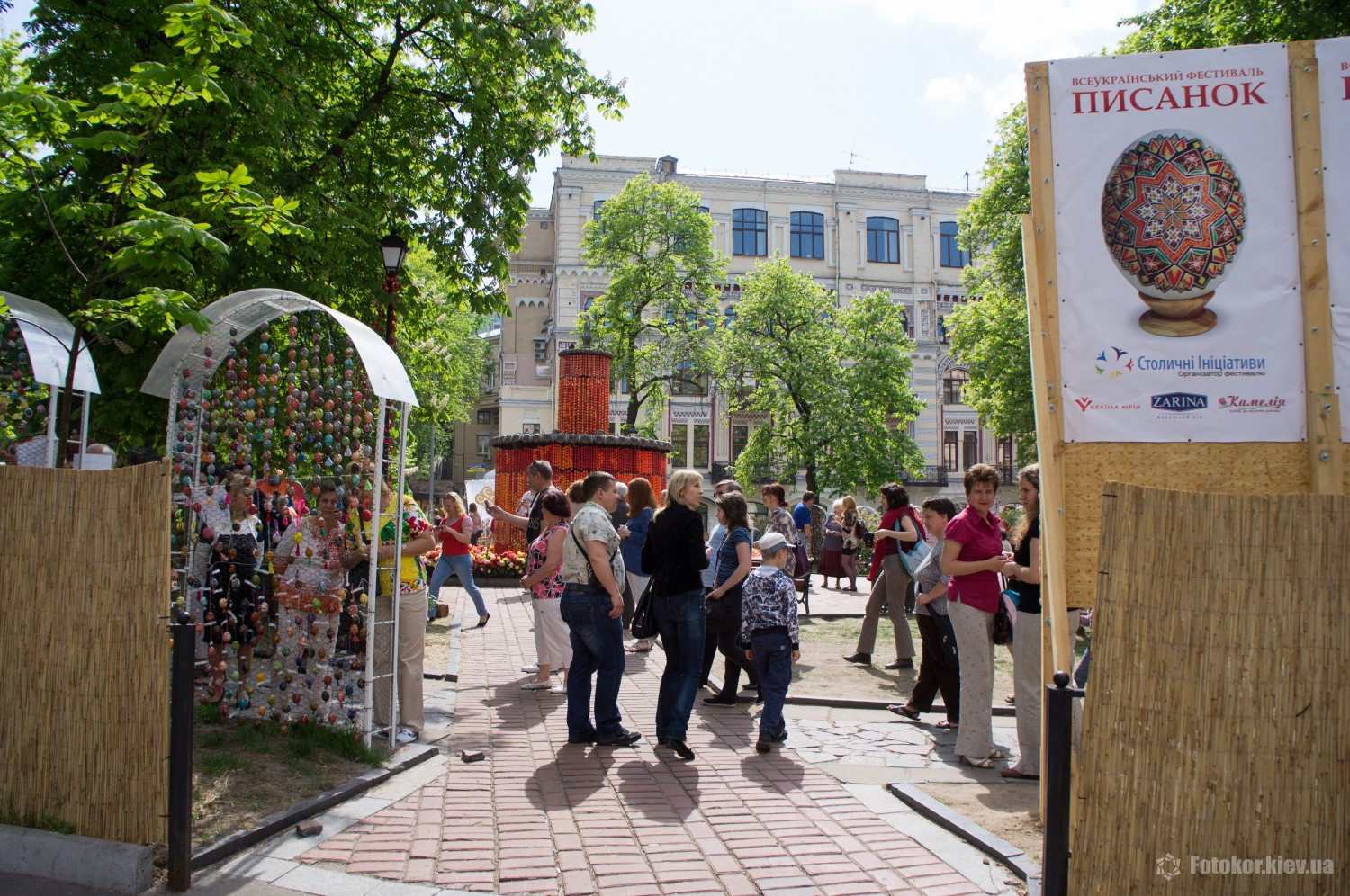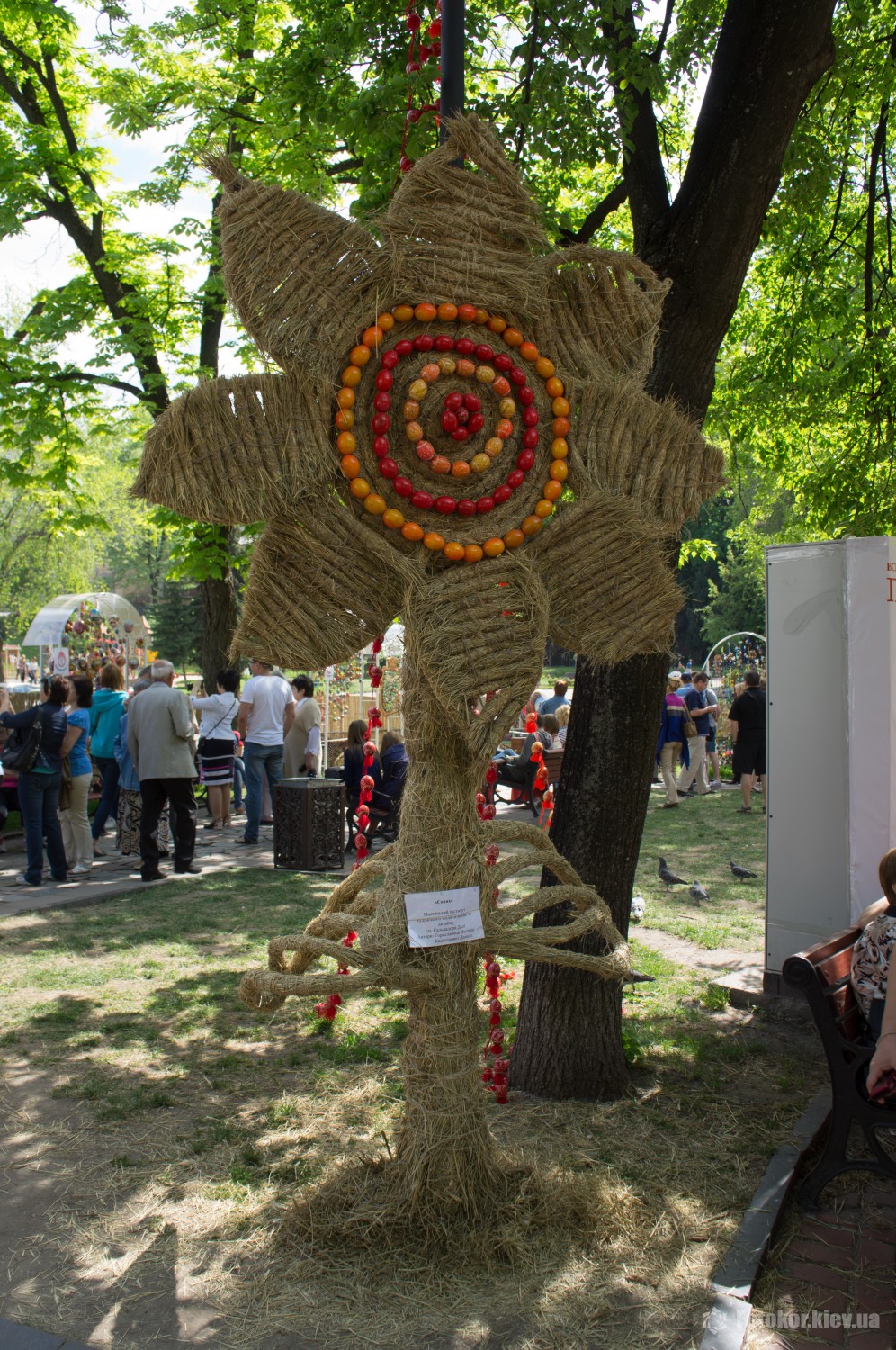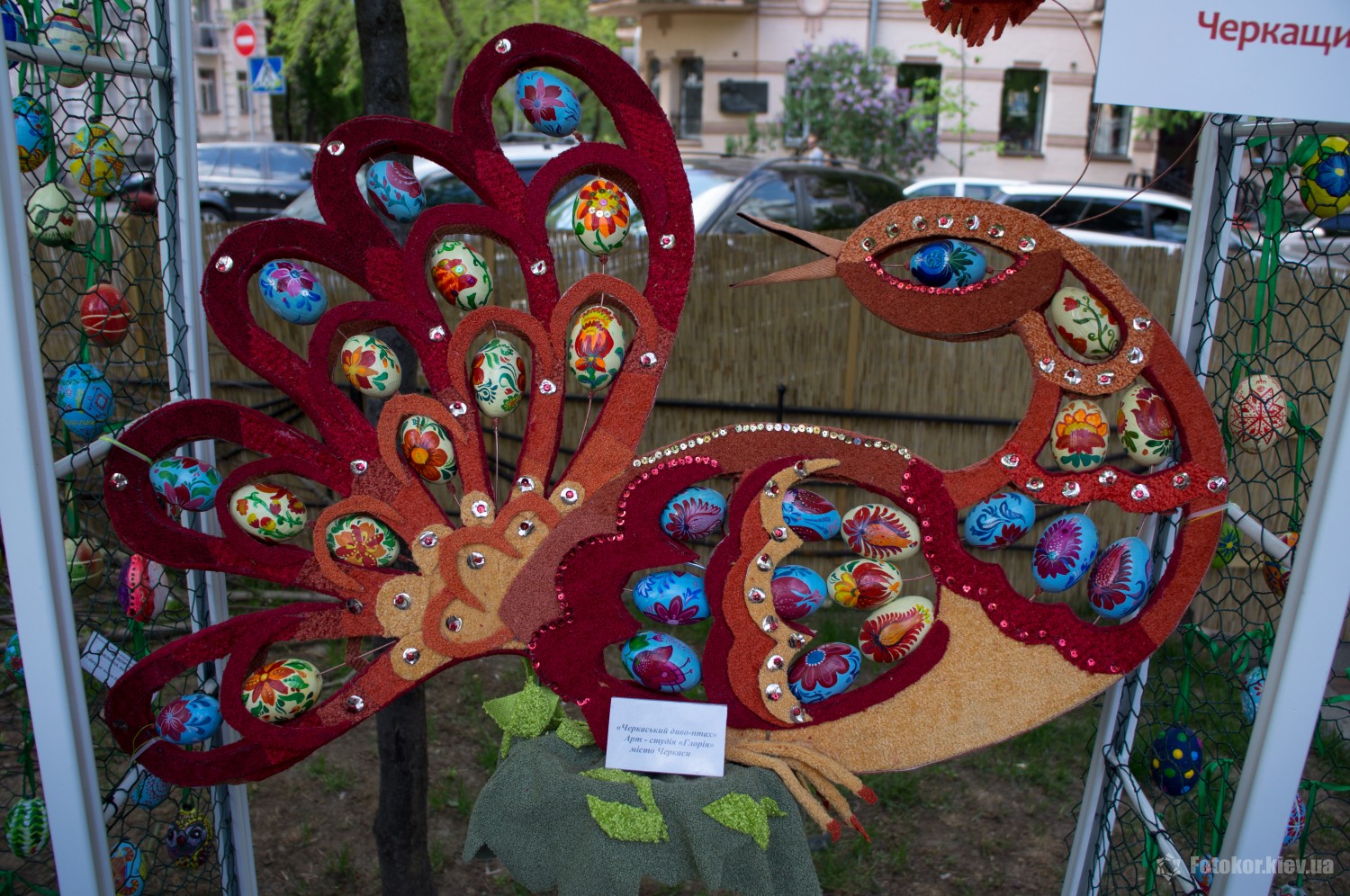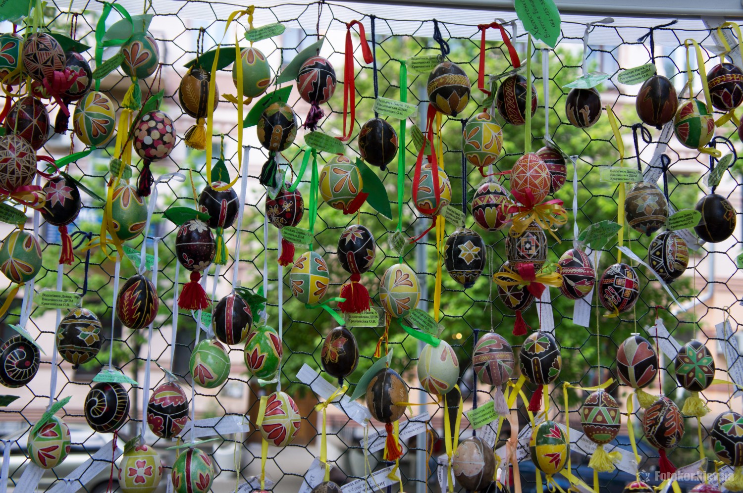 Писанками украшены деревья в сквере, а также старинный фонтан. По периметру сквера установлены специальные металлические беседки и конструкции, на которых развешены десятки тысяч раскрашенных пасхальных яиц.