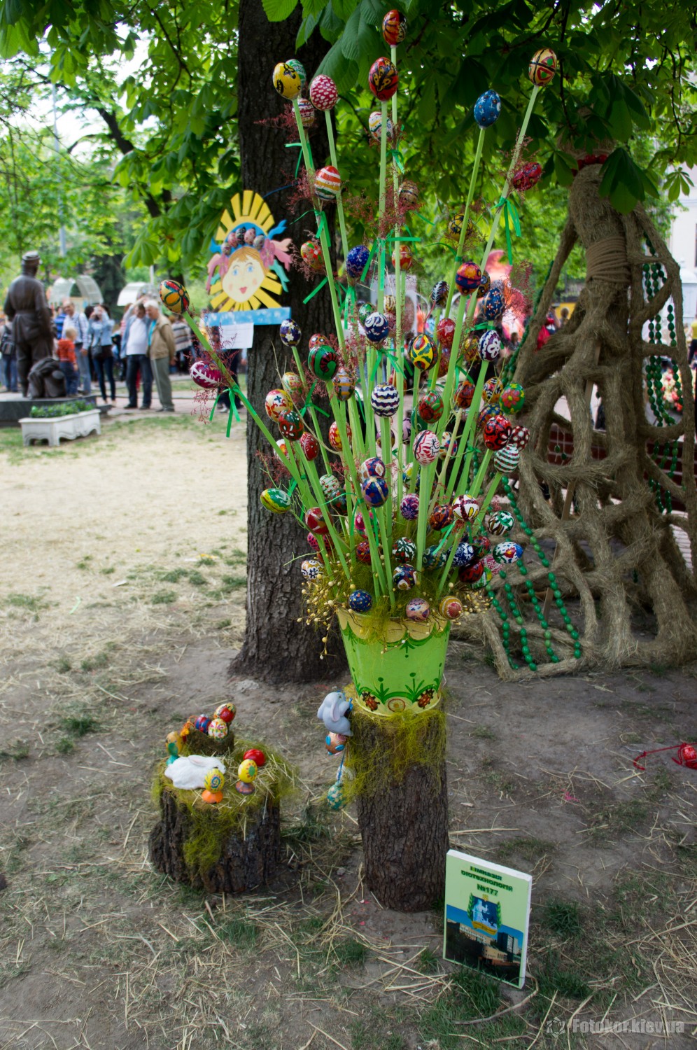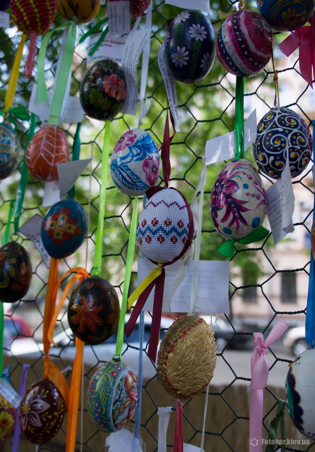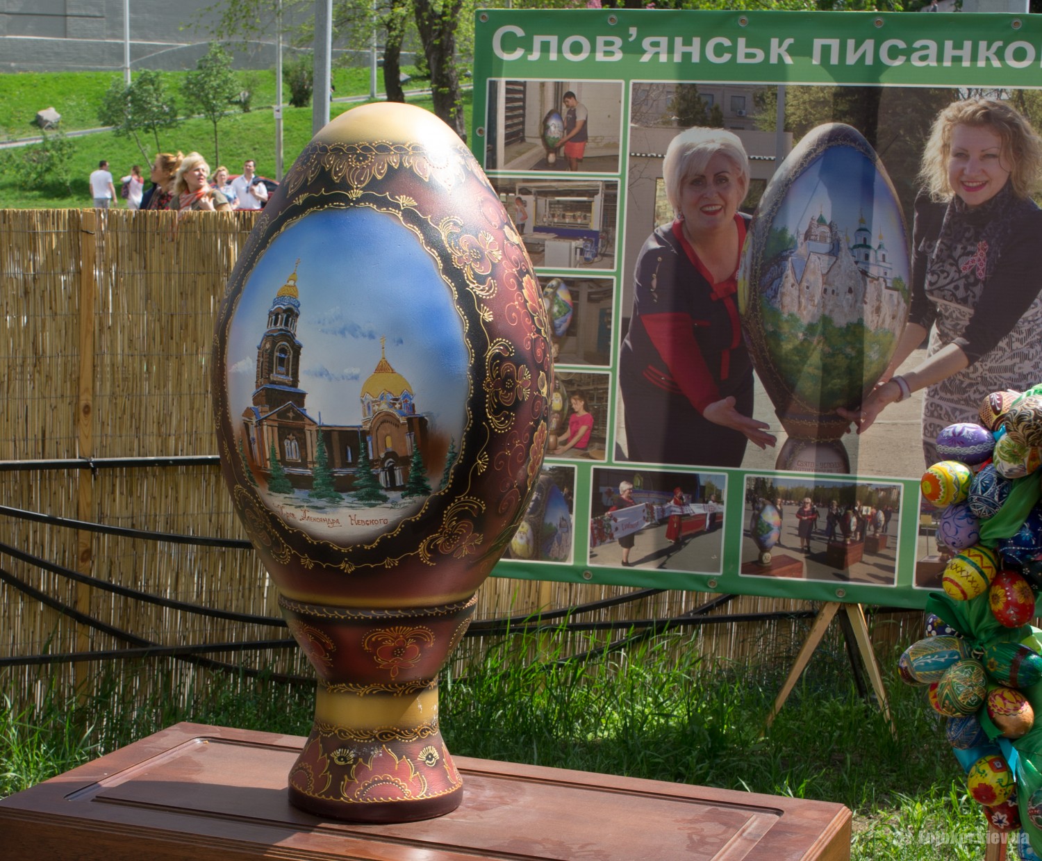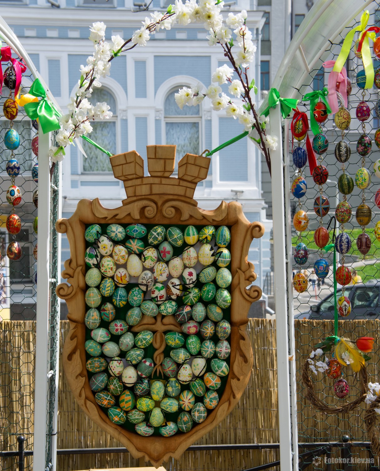 Писанками украшены деревья в сквере, а также старинный фонтан. По периметру сквера установлены специальные металлические беседки и конструкции, на которых развешены десятки тысяч раскрашенных пасхальных яиц.
